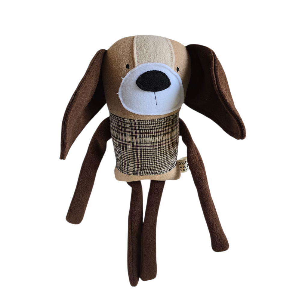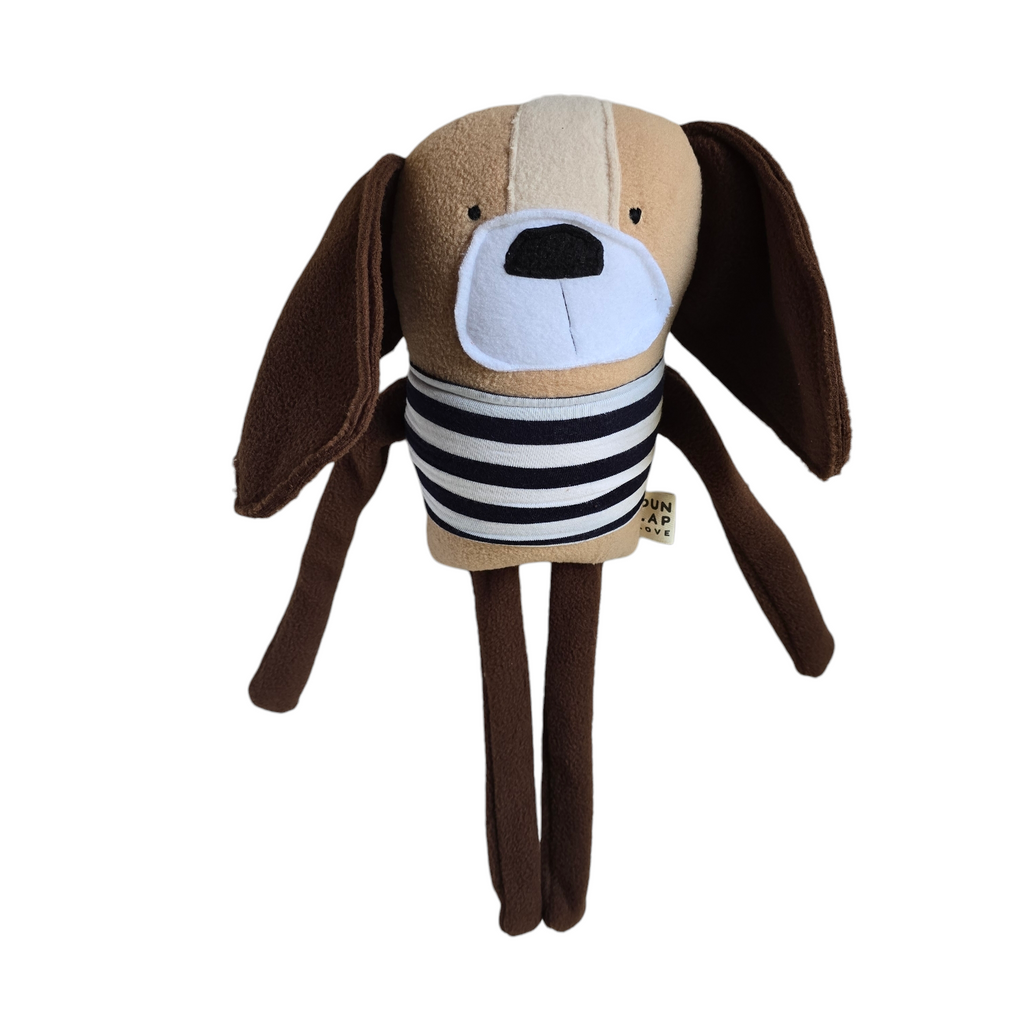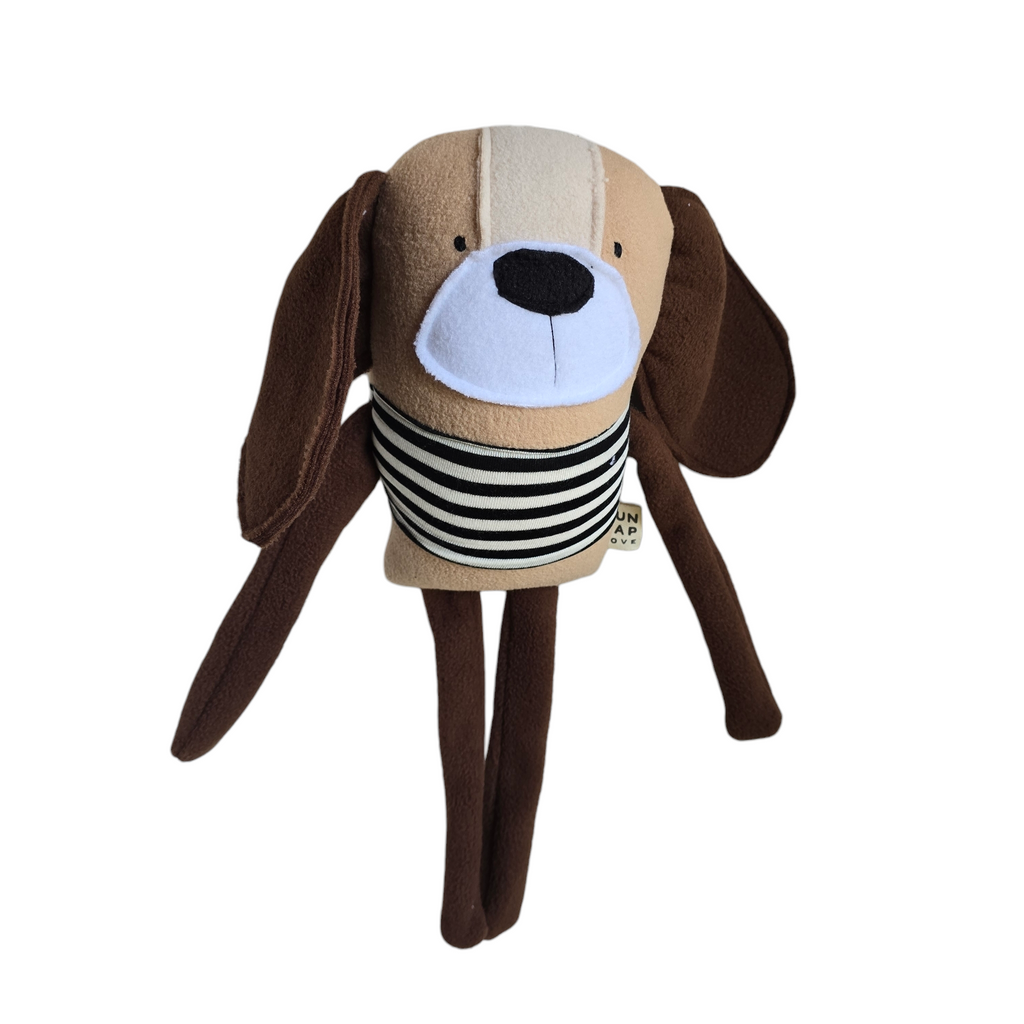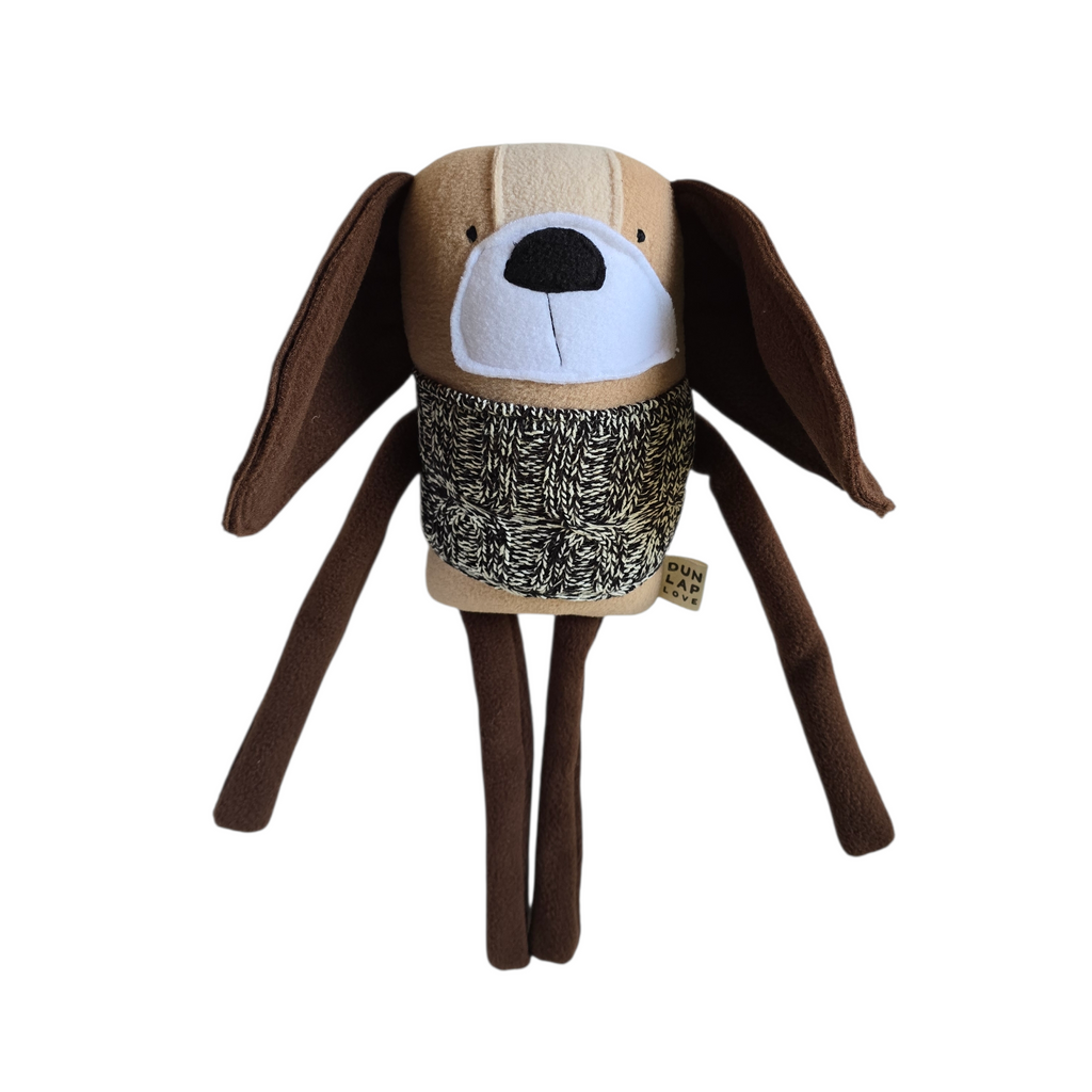 Hank measures approximately 18" long and is made with durable anti-pill fleece and recycled fabric for his top. His eyes are hand embroidered and he is stuffed with cluster stuff to make him extra snuggly.